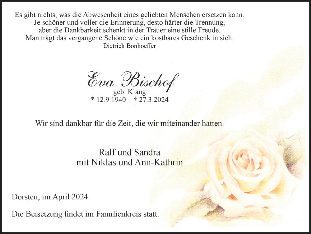 Hier finden Sie alle Traueranzeigen aus der Zeitung, die bisher für Eva Bischof erschienen sind. Weitere Traueranzeigen, die in der Zeitung erscheinen, werden hier ebenfalls aufgelistet