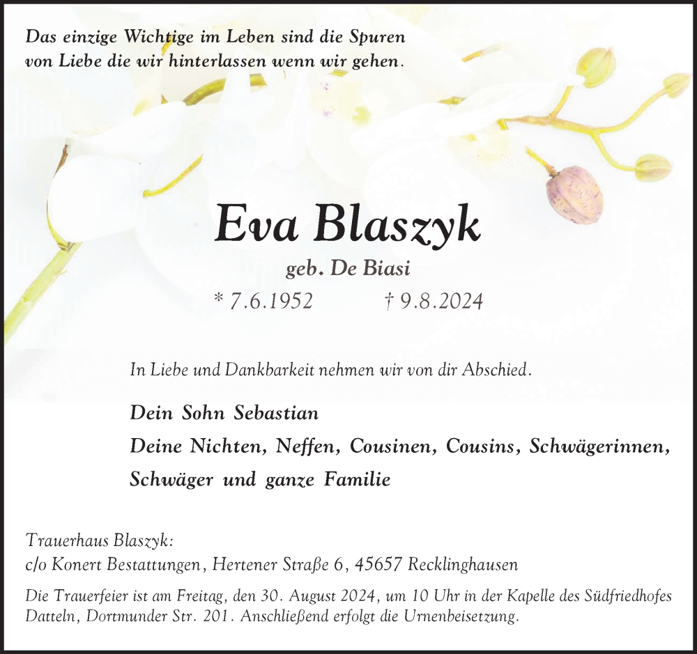 Hier finden Sie alle Traueranzeigen aus der Zeitung, die bisher für Eva Blaszyk erschienen sind. Weitere Traueranzeigen, die in der Zeitung erscheinen, werden hier ebenfalls aufgelistet