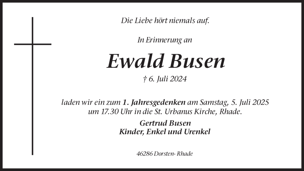 Hier finden Sie alle Traueranzeigen aus der Zeitung, die bisher für Ewald Busen erschienen sind. Weitere Traueranzeigen, die in der Zeitung erscheinen, werden hier ebenfalls aufgelistet