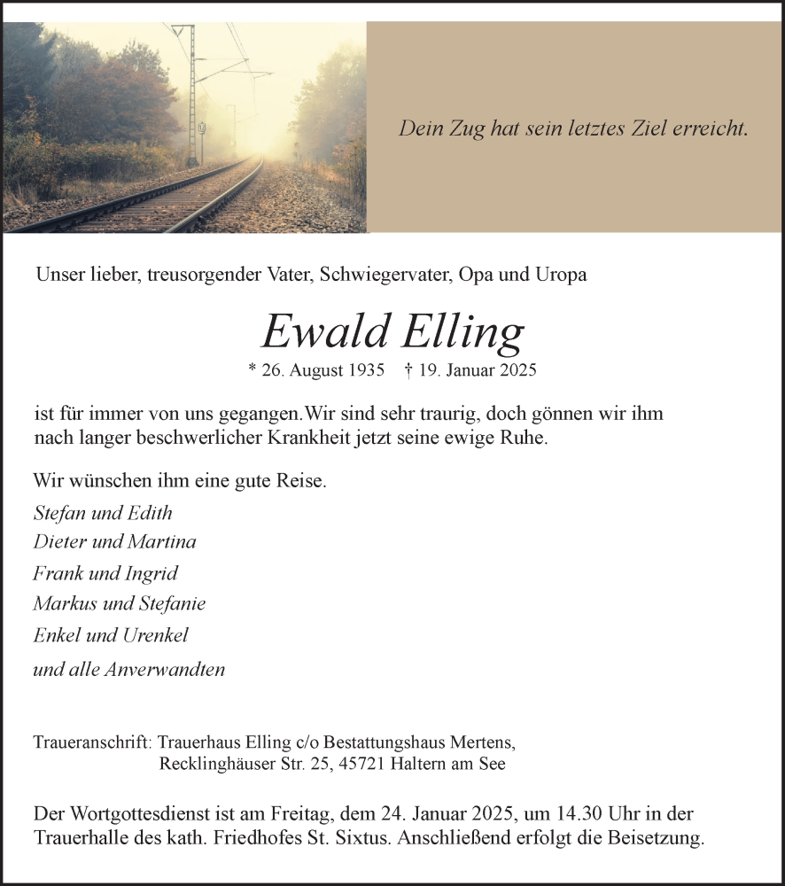 Hier finden Sie alle Traueranzeigen aus der Zeitung, die bisher für Ewald Elling erschienen sind. Weitere Traueranzeigen, die in der Zeitung erscheinen, werden hier ebenfalls aufgelistet