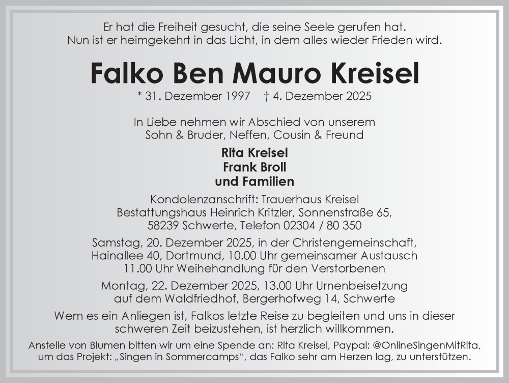 Hier finden Sie alle Traueranzeigen aus der Zeitung, die bisher für Falko Ben Mauro Kreisel erschienen sind. Weitere Traueranzeigen, die in der Zeitung erscheinen, werden hier ebenfalls aufgelistet
