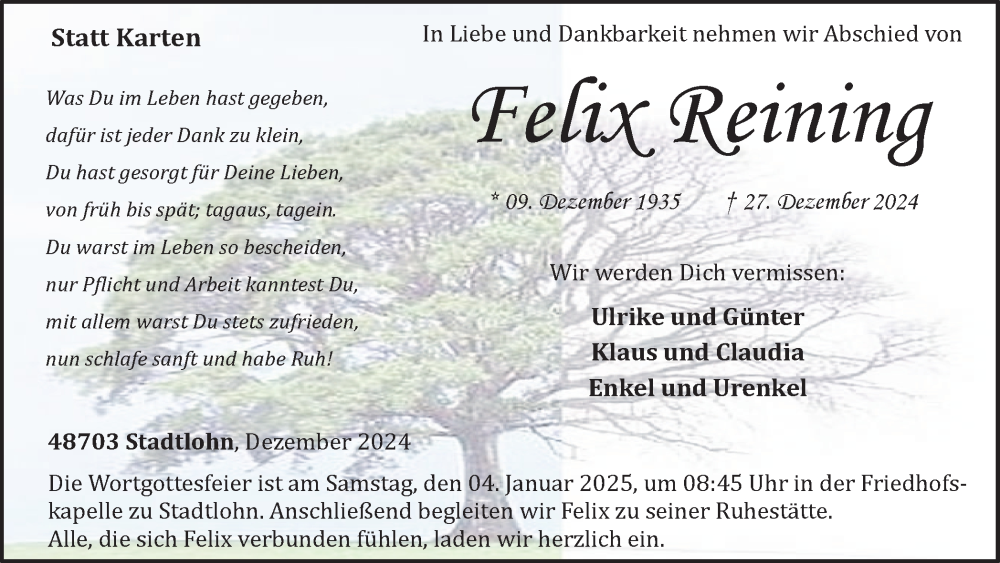 Hier finden Sie alle Traueranzeigen aus der Zeitung, die bisher für Felix Reining erschienen sind. Weitere Traueranzeigen, die in der Zeitung erscheinen, werden hier ebenfalls aufgelistet