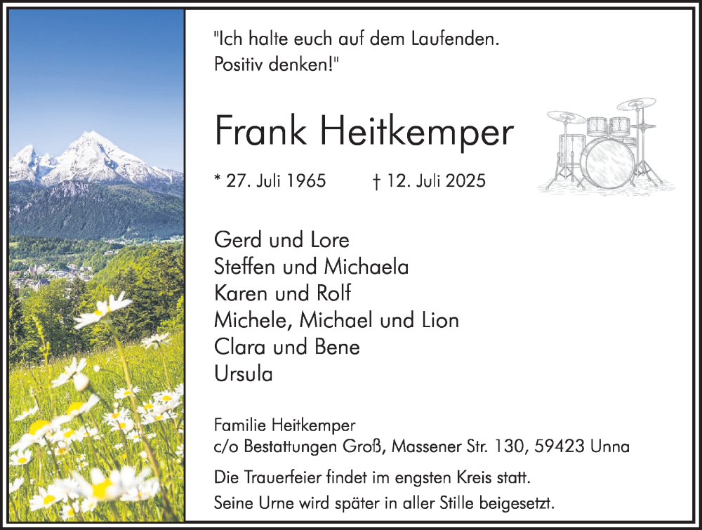 Hier finden Sie alle Traueranzeigen aus der Zeitung, die bisher für Frank Heitkemper erschienen sind. Weitere Traueranzeigen, die in der Zeitung erscheinen, werden hier ebenfalls aufgelistet