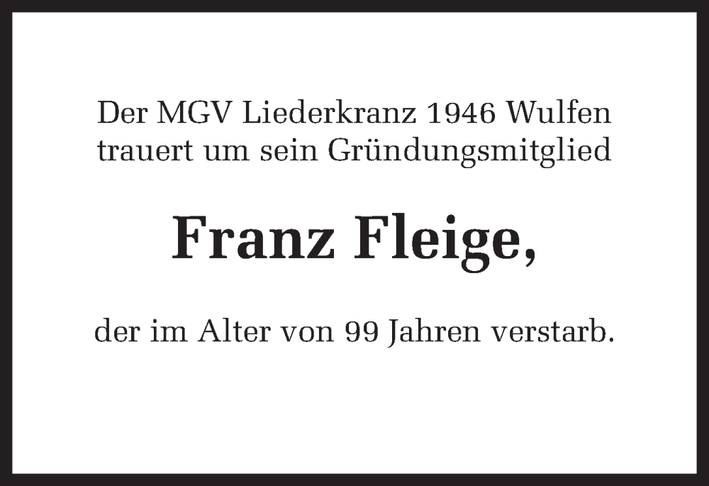 Hier finden Sie alle Traueranzeigen aus der Zeitung, die bisher für Franz Fleige erschienen sind. Weitere Traueranzeigen, die in der Zeitung erscheinen, werden hier ebenfalls aufgelistet