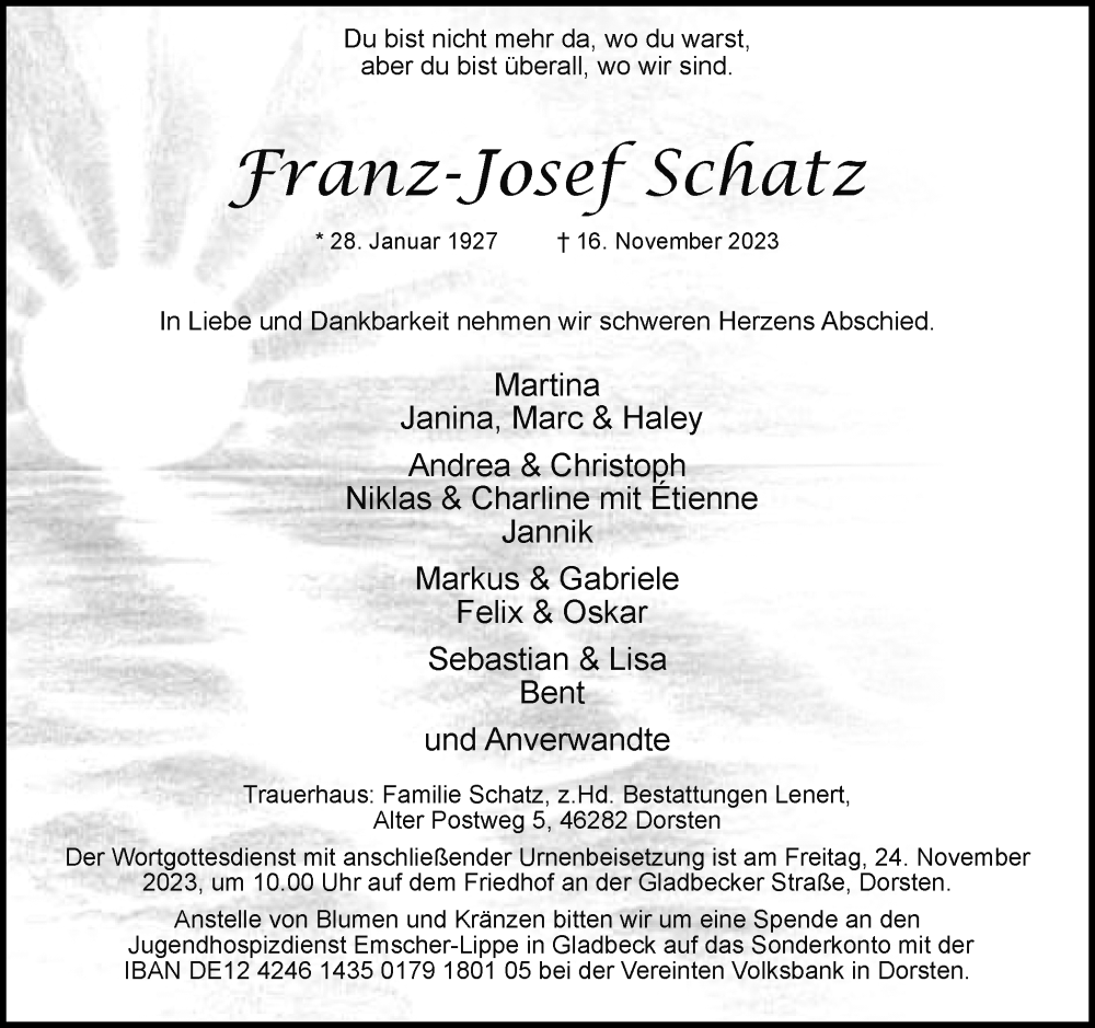 Hier finden Sie alle Traueranzeigen aus der Zeitung, die bisher für Franz-Josef Schatz erschienen sind. Weitere Traueranzeigen, die in der Zeitung erscheinen, werden hier ebenfalls aufgelistet