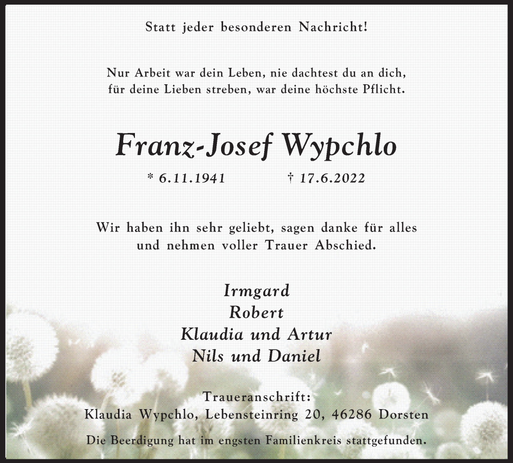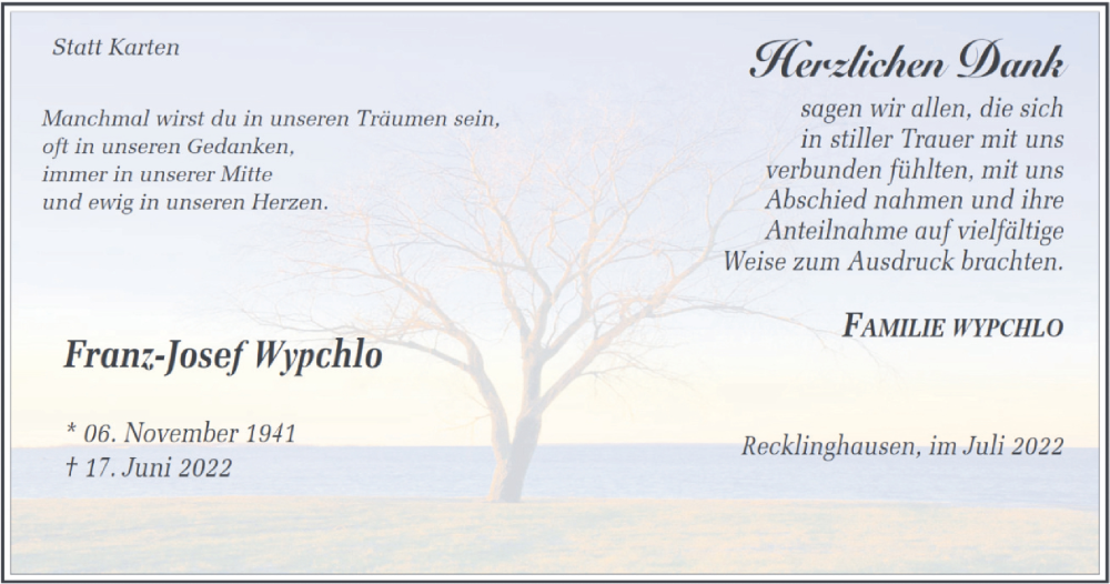 Hier finden Sie alle Traueranzeigen aus der Zeitung, die bisher für Franz-Josef Wypchlo erschienen sind. Weitere Traueranzeigen, die in der Zeitung erscheinen, werden hier ebenfalls aufgelistet