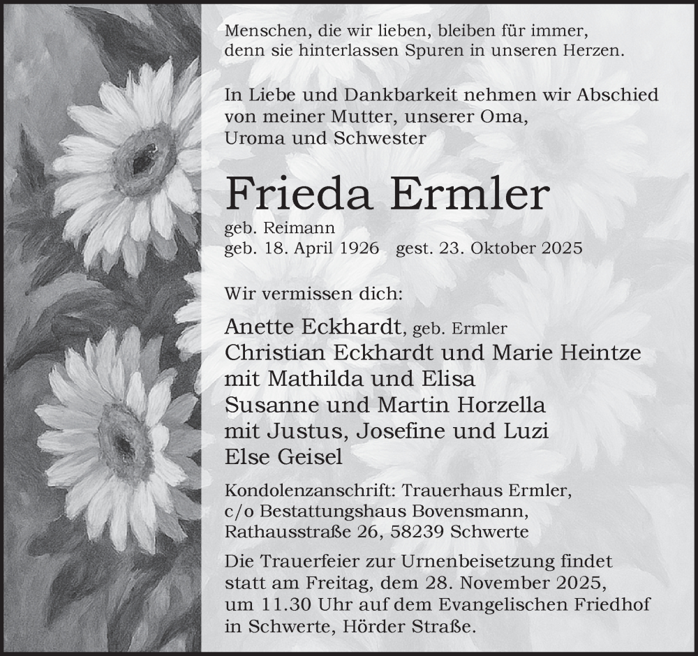 Hier finden Sie alle Traueranzeigen aus der Zeitung, die bisher für Frieda Ermler erschienen sind. Weitere Traueranzeigen, die in der Zeitung erscheinen, werden hier ebenfalls aufgelistet