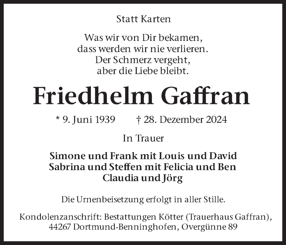 Hier finden Sie alle Traueranzeigen aus der Zeitung, die bisher für Friedhelm Gaffran erschienen sind. Weitere Traueranzeigen, die in der Zeitung erscheinen, werden hier ebenfalls aufgelistet