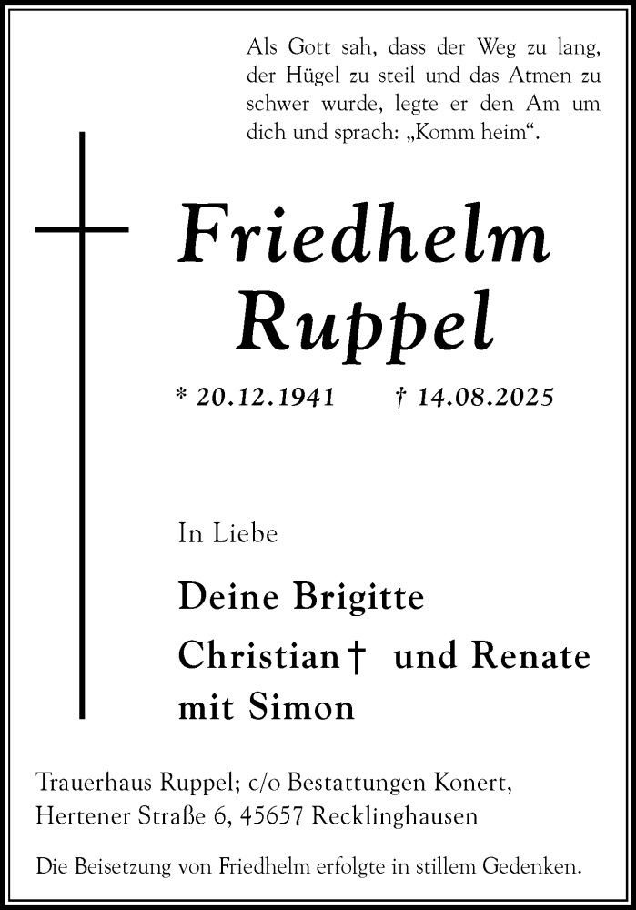Hier finden Sie alle Traueranzeigen aus der Zeitung, die bisher für Friedhelm Ruppel erschienen sind. Weitere Traueranzeigen, die in der Zeitung erscheinen, werden hier ebenfalls aufgelistet