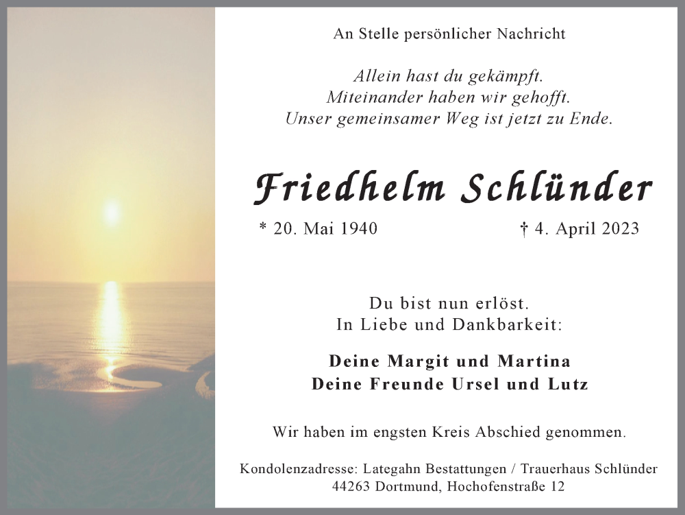 Hier finden Sie alle Traueranzeigen aus der Zeitung, die bisher für Friedhelm Schlünder erschienen sind. Weitere Traueranzeigen, die in der Zeitung erscheinen, werden hier ebenfalls aufgelistet