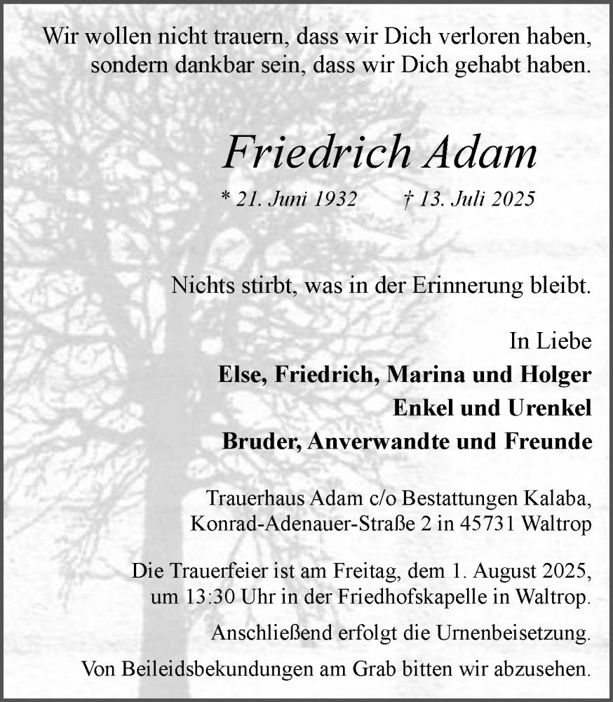 Hier finden Sie alle Traueranzeigen aus der Zeitung, die bisher für Friedrich Adam erschienen sind. Weitere Traueranzeigen, die in der Zeitung erscheinen, werden hier ebenfalls aufgelistet