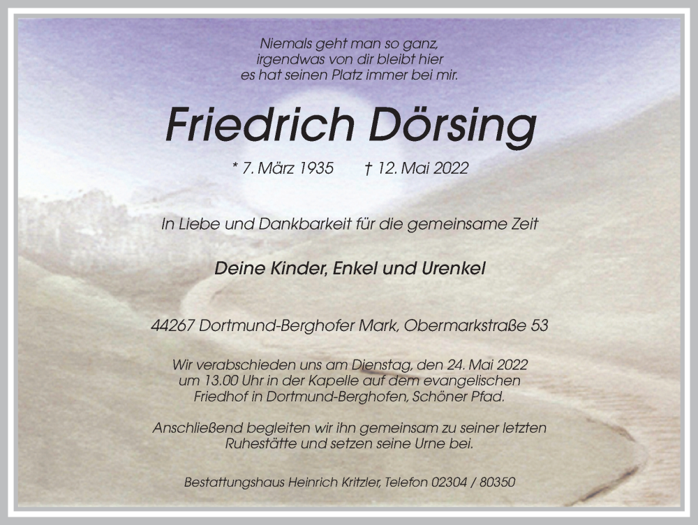 Hier finden Sie alle Traueranzeigen aus der Zeitung, die bisher für Friedrich Dörsing erschienen sind. Weitere Traueranzeigen, die in der Zeitung erscheinen, werden hier ebenfalls aufgelistet