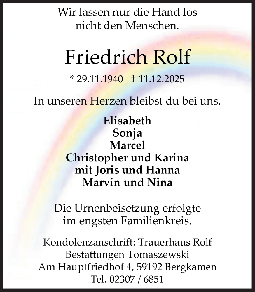 Hier finden Sie alle Traueranzeigen aus der Zeitung, die bisher für Friedrich Rolf erschienen sind. Weitere Traueranzeigen, die in der Zeitung erscheinen, werden hier ebenfalls aufgelistet