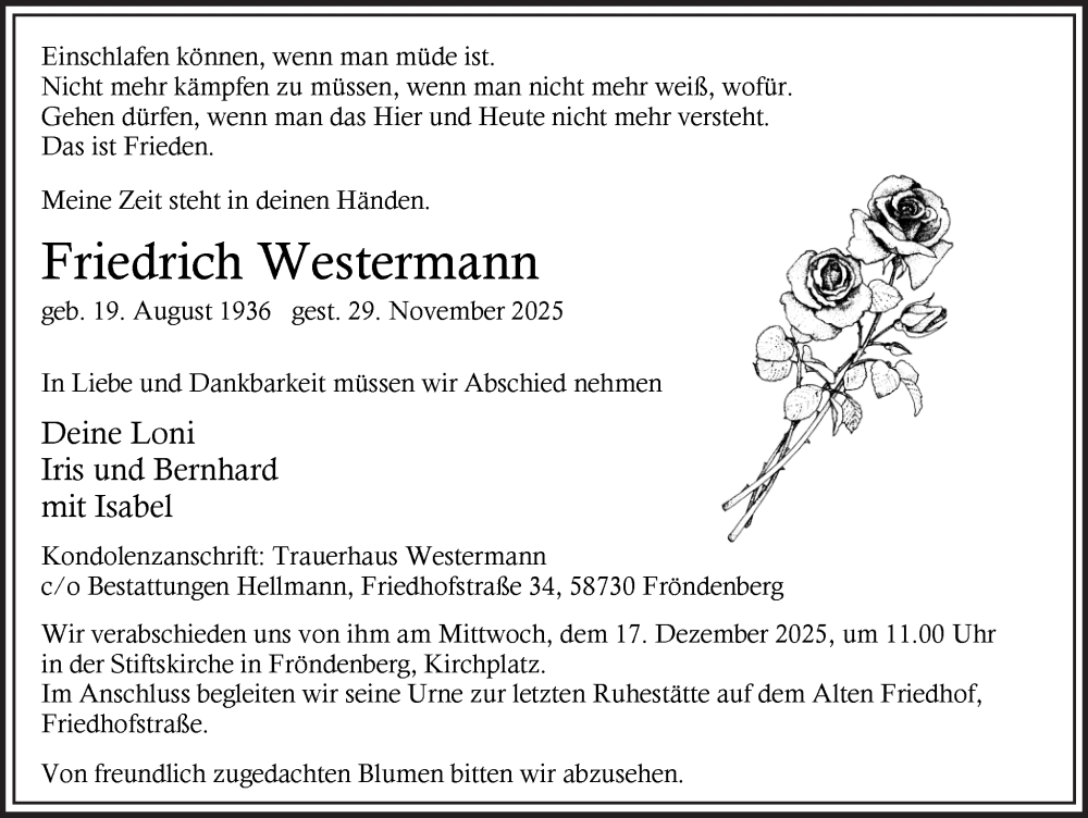Hier finden Sie alle Traueranzeigen aus der Zeitung, die bisher für Friedrich Westermann erschienen sind. Weitere Traueranzeigen, die in der Zeitung erscheinen, werden hier ebenfalls aufgelistet