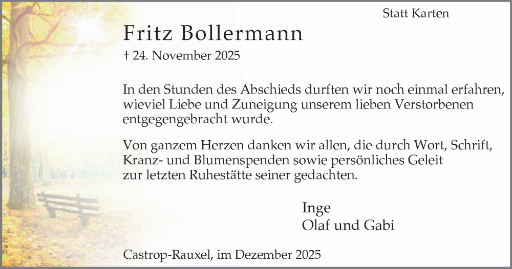 Hier finden Sie alle Traueranzeigen aus der Zeitung, die bisher für Fritz Bollermann erschienen sind. Weitere Traueranzeigen, die in der Zeitung erscheinen, werden hier ebenfalls aufgelistet