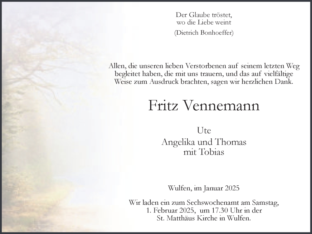 Hier finden Sie alle Traueranzeigen aus der Zeitung, die bisher für Fritz Vennemann erschienen sind. Weitere Traueranzeigen, die in der Zeitung erscheinen, werden hier ebenfalls aufgelistet