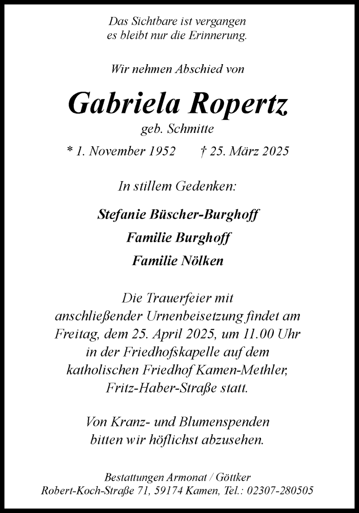 Hier finden Sie alle Traueranzeigen aus der Zeitung, die bisher für Gabriela Ropertz erschienen sind. Weitere Traueranzeigen, die in der Zeitung erscheinen, werden hier ebenfalls aufgelistet