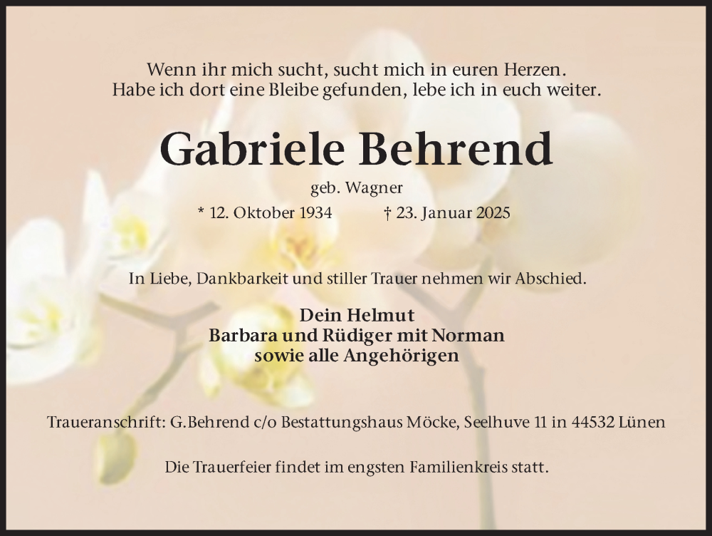 Hier finden Sie alle Traueranzeigen aus der Zeitung, die bisher für Gabriele Behrend erschienen sind. Weitere Traueranzeigen, die in der Zeitung erscheinen, werden hier ebenfalls aufgelistet