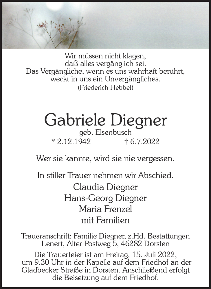 Hier finden Sie alle Traueranzeigen aus der Zeitung, die bisher für Gabriele Diegner erschienen sind. Weitere Traueranzeigen, die in der Zeitung erscheinen, werden hier ebenfalls aufgelistet