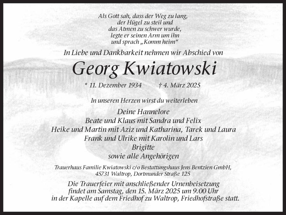Hier finden Sie alle Traueranzeigen aus der Zeitung, die bisher für Georg Kwiatowski erschienen sind. Weitere Traueranzeigen, die in der Zeitung erscheinen, werden hier ebenfalls aufgelistet
