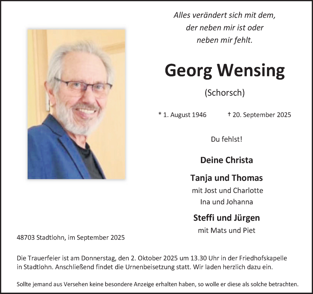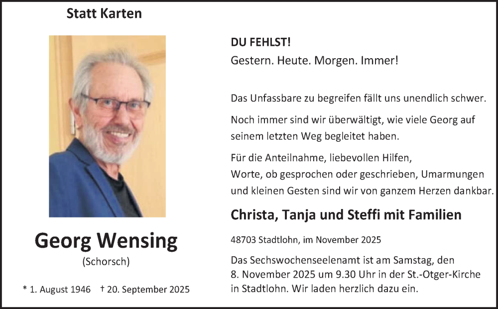 Hier finden Sie alle Traueranzeigen aus der Zeitung, die bisher für Georg Wensing erschienen sind. Weitere Traueranzeigen, die in der Zeitung erscheinen, werden hier ebenfalls aufgelistet