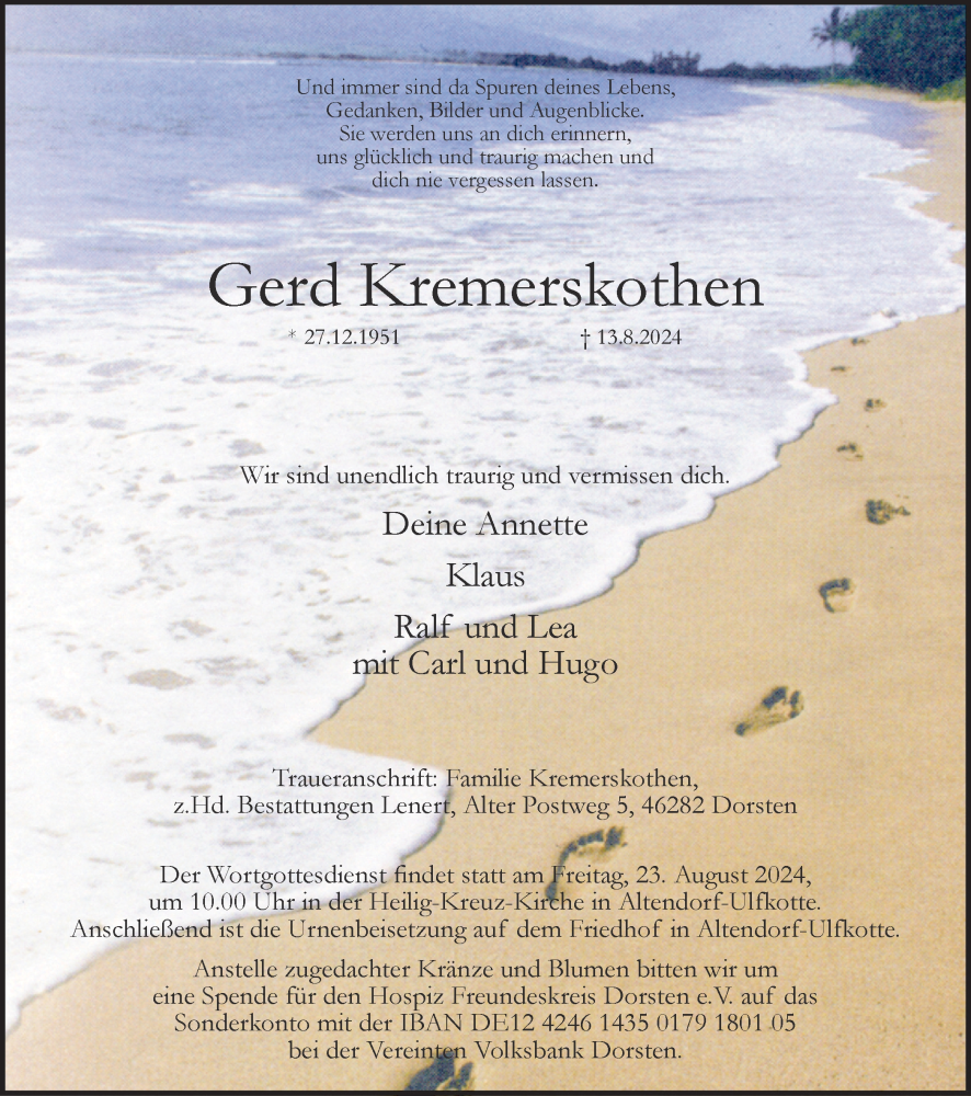 Hier finden Sie alle Traueranzeigen aus der Zeitung, die bisher für Gerd Kremerskothen erschienen sind. Weitere Traueranzeigen, die in der Zeitung erscheinen, werden hier ebenfalls aufgelistet