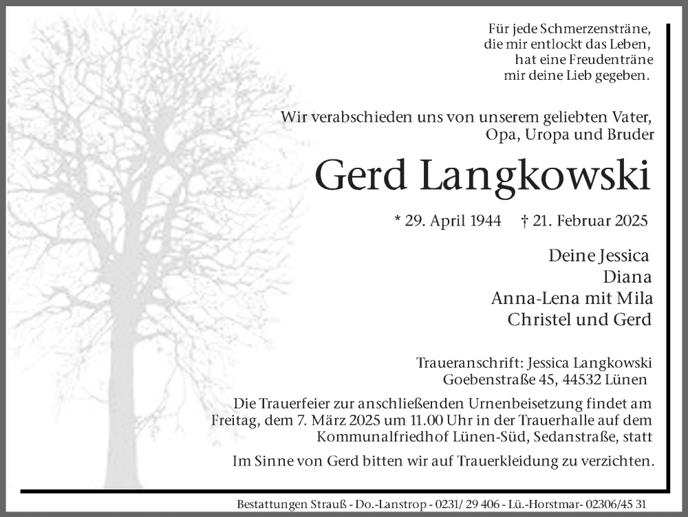 Hier finden Sie alle Traueranzeigen aus der Zeitung, die bisher für Gerd Langkowski erschienen sind. Weitere Traueranzeigen, die in der Zeitung erscheinen, werden hier ebenfalls aufgelistet