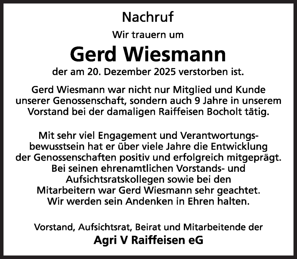 Hier finden Sie alle Traueranzeigen aus der Zeitung, die bisher für Gerd Wiesmann erschienen sind. Weitere Traueranzeigen, die in der Zeitung erscheinen, werden hier ebenfalls aufgelistet