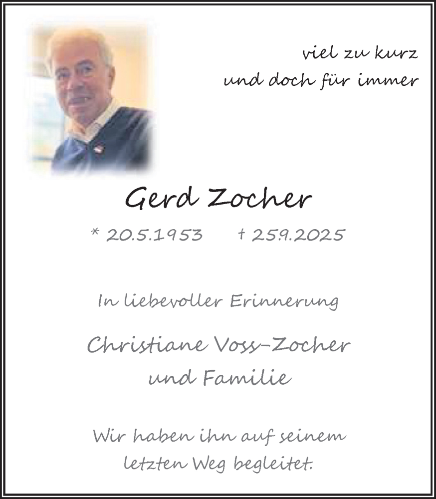 Hier finden Sie alle Traueranzeigen aus der Zeitung, die bisher für Gerd Zocher erschienen sind. Weitere Traueranzeigen, die in der Zeitung erscheinen, werden hier ebenfalls aufgelistet