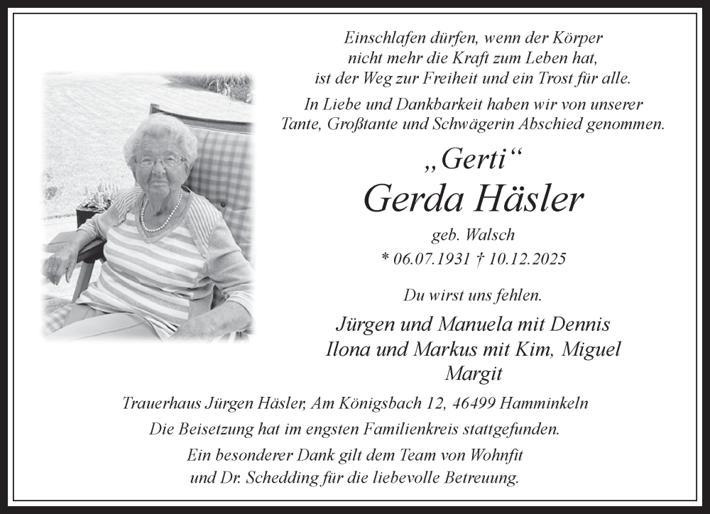 Hier finden Sie alle Traueranzeigen aus der Zeitung, die bisher für Gerda Häsler erschienen sind. Weitere Traueranzeigen, die in der Zeitung erscheinen, werden hier ebenfalls aufgelistet