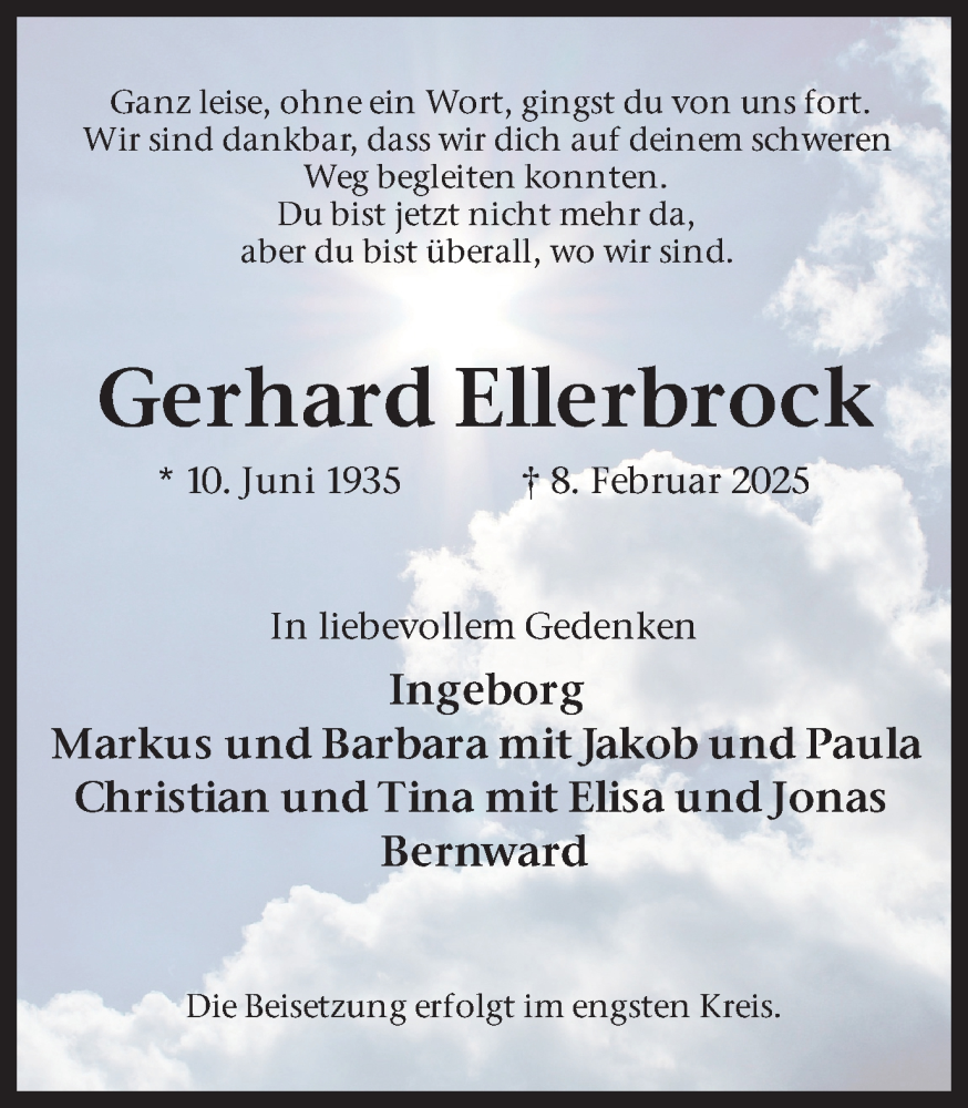 Hier finden Sie alle Traueranzeigen aus der Zeitung, die bisher für Gerhard Ellerbrock erschienen sind. Weitere Traueranzeigen, die in der Zeitung erscheinen, werden hier ebenfalls aufgelistet