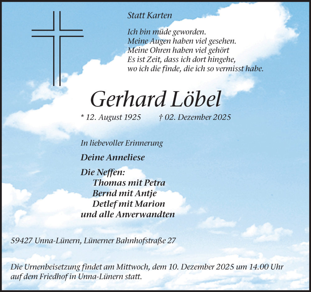 Hier finden Sie alle Traueranzeigen aus der Zeitung, die bisher für Gerhard Löbel erschienen sind. Weitere Traueranzeigen, die in der Zeitung erscheinen, werden hier ebenfalls aufgelistet