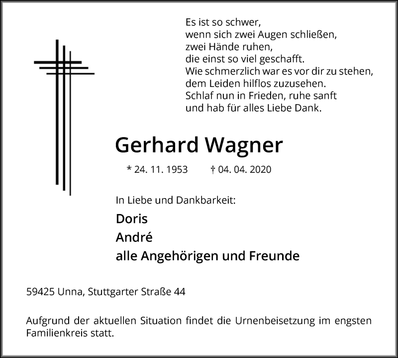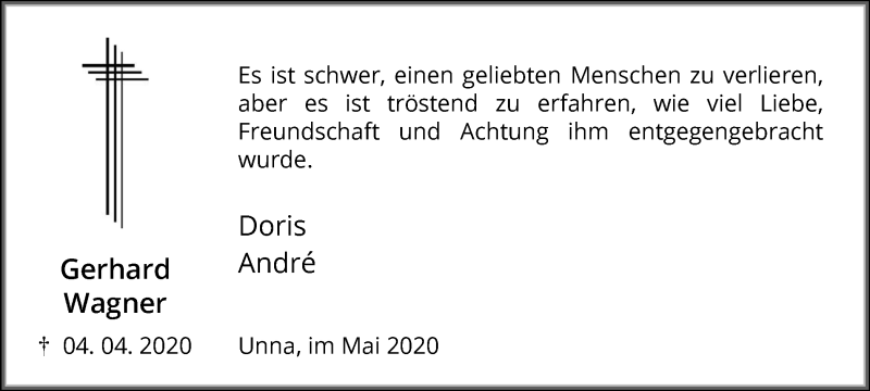 Hier finden Sie alle Traueranzeigen aus der Zeitung, die bisher für Gerhard Wagner erschienen sind. Weitere Traueranzeigen, die in der Zeitung erscheinen, werden hier ebenfalls aufgelistet