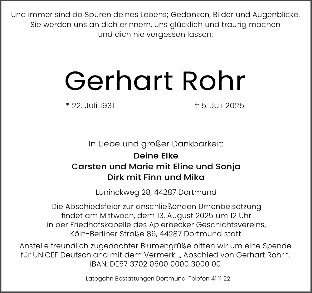 Hier finden Sie alle Traueranzeigen aus der Zeitung, die bisher für Gerhart Rohr erschienen sind. Weitere Traueranzeigen, die in der Zeitung erscheinen, werden hier ebenfalls aufgelistet