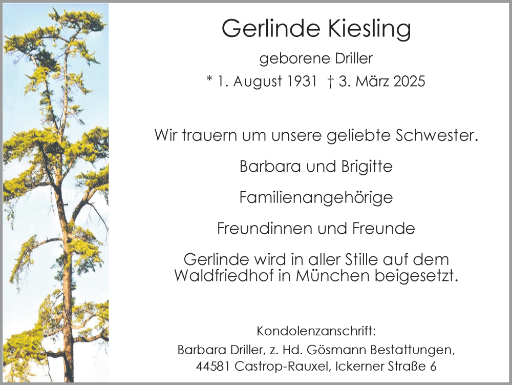 Hier finden Sie alle Traueranzeigen aus der Zeitung, die bisher für Gerlinde Kiesling erschienen sind. Weitere Traueranzeigen, die in der Zeitung erscheinen, werden hier ebenfalls aufgelistet