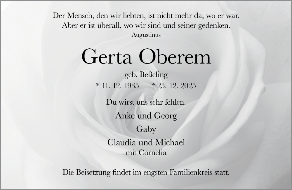 Hier finden Sie alle Traueranzeigen aus der Zeitung, die bisher für Gerta Oberem erschienen sind. Weitere Traueranzeigen, die in der Zeitung erscheinen, werden hier ebenfalls aufgelistet
