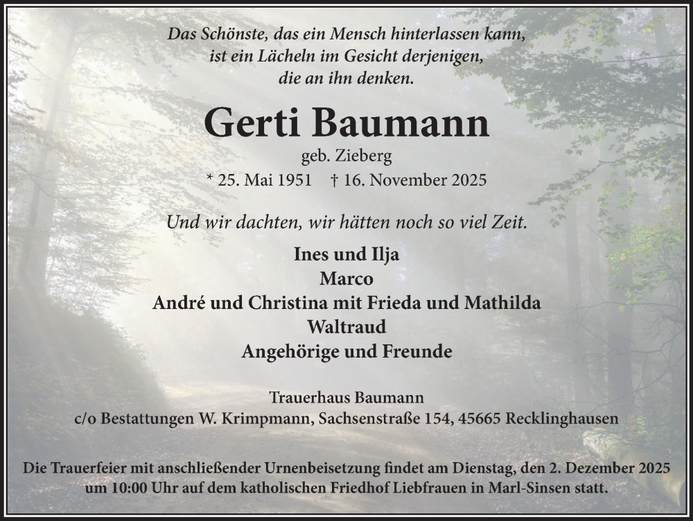 Hier finden Sie alle Traueranzeigen aus der Zeitung, die bisher für Gerti Baumann erschienen sind. Weitere Traueranzeigen, die in der Zeitung erscheinen, werden hier ebenfalls aufgelistet