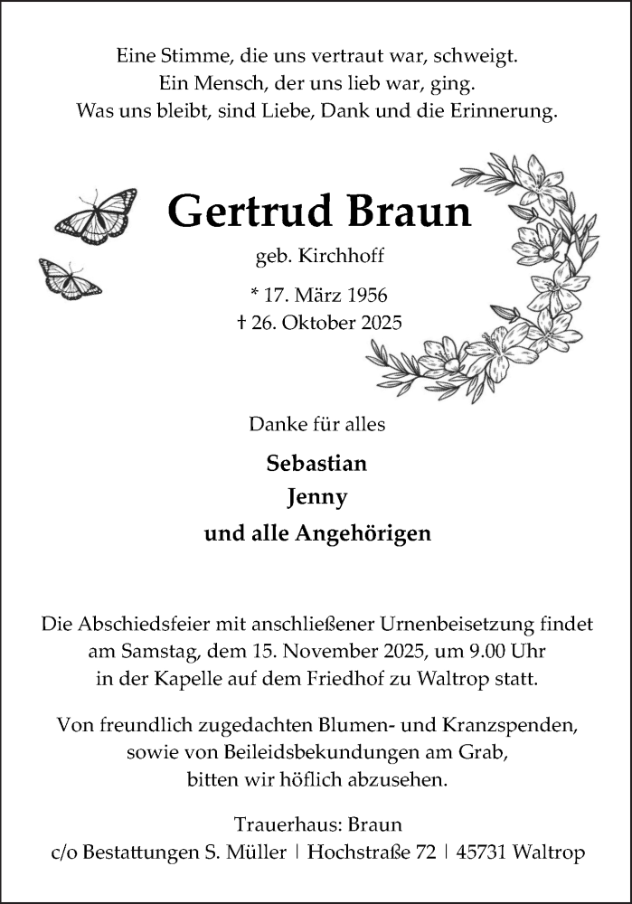 Hier finden Sie alle Traueranzeigen aus der Zeitung, die bisher für Gertrud Braun erschienen sind. Weitere Traueranzeigen, die in der Zeitung erscheinen, werden hier ebenfalls aufgelistet