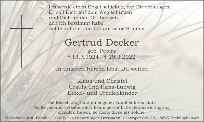 Hier finden Sie alle Traueranzeigen aus der Zeitung, die bisher für Gertrud Decker erschienen sind. Weitere Traueranzeigen, die in der Zeitung erscheinen, werden hier ebenfalls aufgelistet