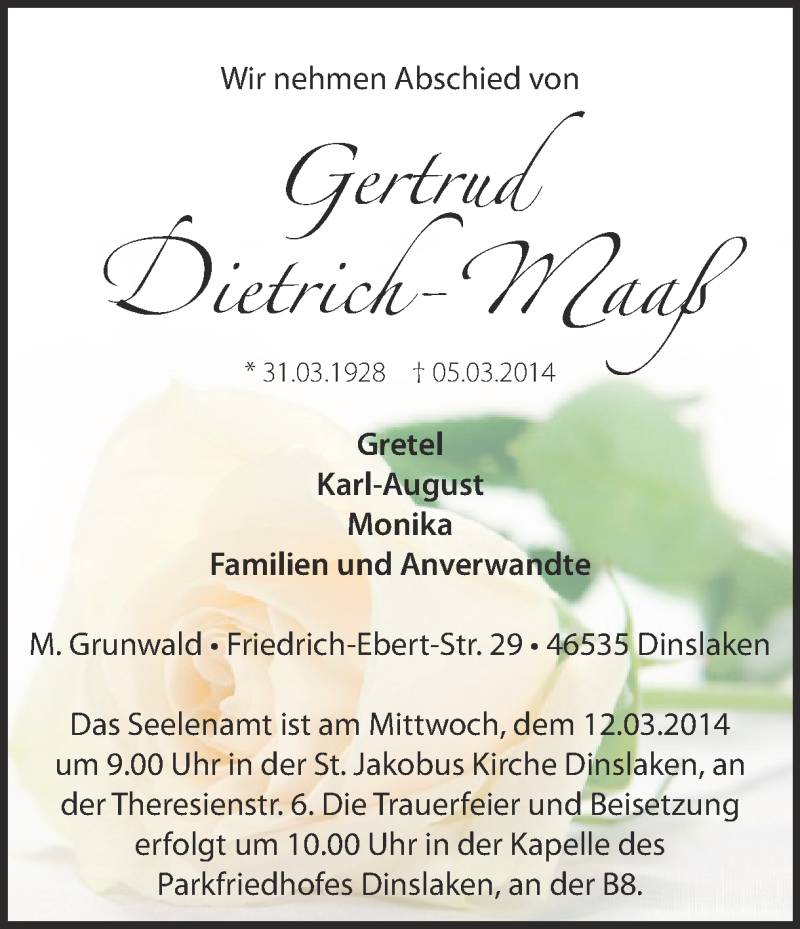 Hier finden Sie alle Traueranzeigen aus der Zeitung, die bisher für Gertrud Dietrich-Maaß erschienen sind. Weitere Traueranzeigen, die in der Zeitung erscheinen, werden hier ebenfalls aufgelistet