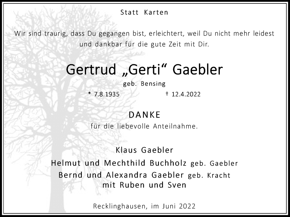 Hier finden Sie alle Traueranzeigen aus der Zeitung, die bisher für Gertrud Gaebler erschienen sind. Weitere Traueranzeigen, die in der Zeitung erscheinen, werden hier ebenfalls aufgelistet