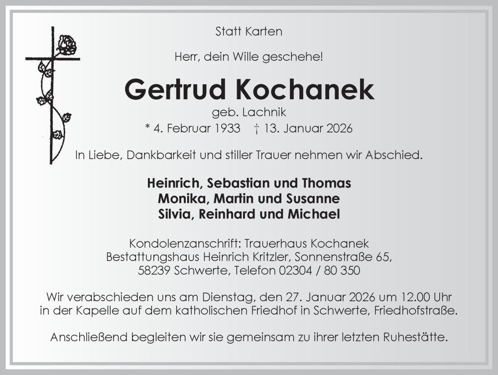 Hier finden Sie alle Traueranzeigen aus der Zeitung, die bisher für Gertrud Kochanek erschienen sind. Weitere Traueranzeigen, die in der Zeitung erscheinen, werden hier ebenfalls aufgelistet