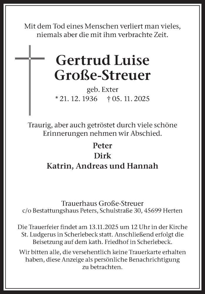 Hier finden Sie alle Traueranzeigen aus der Zeitung, die bisher für Gertrud Luise Große-Streuer erschienen sind. Weitere Traueranzeigen, die in der Zeitung erscheinen, werden hier ebenfalls aufgelistet