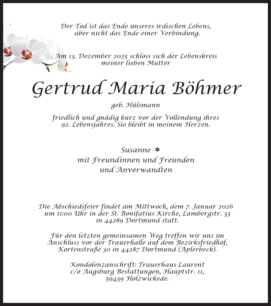 Hier finden Sie alle Traueranzeigen aus der Zeitung, die bisher für Gertrud Maria Böhmer erschienen sind. Weitere Traueranzeigen, die in der Zeitung erscheinen, werden hier ebenfalls aufgelistet