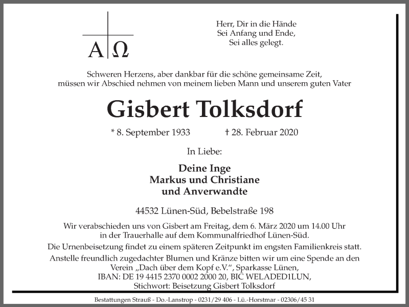 Hier finden Sie alle Traueranzeigen aus der Zeitung, die bisher für Gisbert Tolksdorf erschienen sind. Weitere Traueranzeigen, die in der Zeitung erscheinen, werden hier ebenfalls aufgelistet