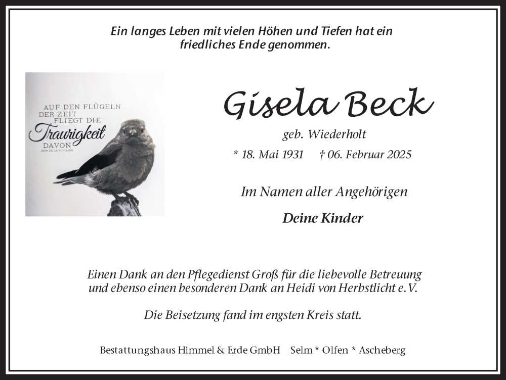 Hier finden Sie alle Traueranzeigen aus der Zeitung, die bisher für Gisela Beck erschienen sind. Weitere Traueranzeigen, die in der Zeitung erscheinen, werden hier ebenfalls aufgelistet