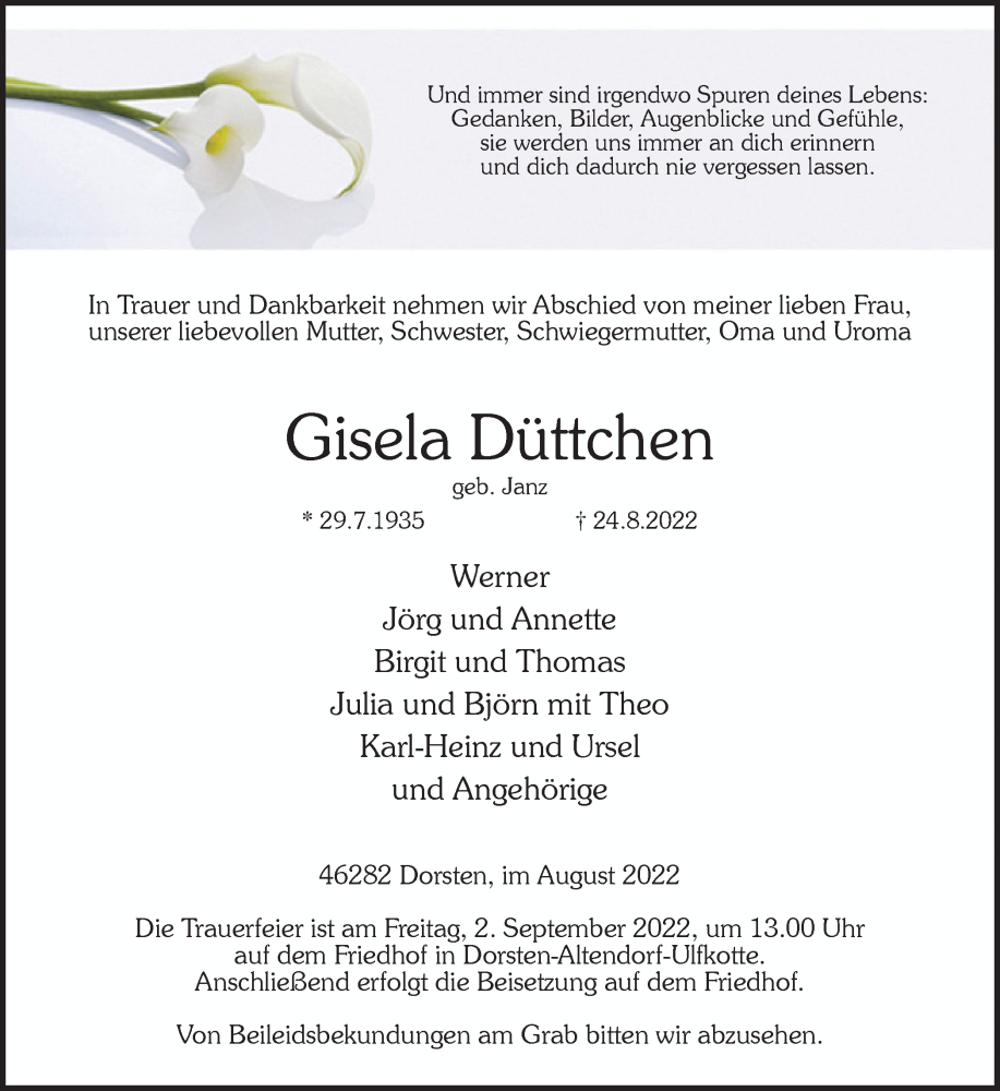 Hier finden Sie alle Traueranzeigen aus der Zeitung, die bisher für Gisela Düttchen erschienen sind. Weitere Traueranzeigen, die in der Zeitung erscheinen, werden hier ebenfalls aufgelistet
