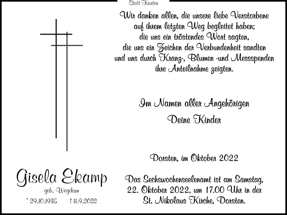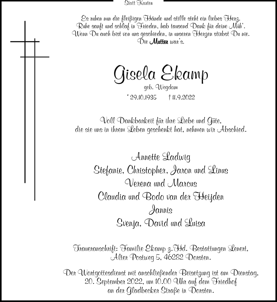 Hier finden Sie alle Traueranzeigen aus der Zeitung, die bisher für Gisela Ekamp erschienen sind. Weitere Traueranzeigen, die in der Zeitung erscheinen, werden hier ebenfalls aufgelistet