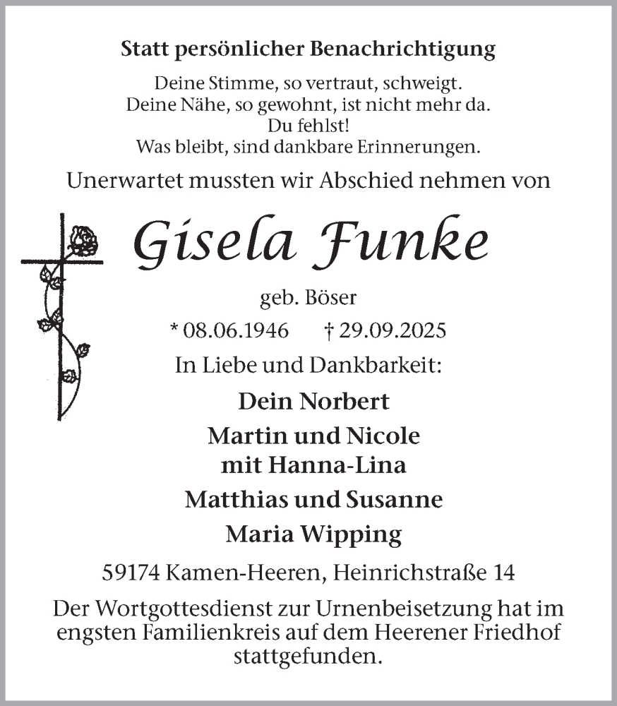 Hier finden Sie alle Traueranzeigen aus der Zeitung, die bisher für Gisela Funke erschienen sind. Weitere Traueranzeigen, die in der Zeitung erscheinen, werden hier ebenfalls aufgelistet