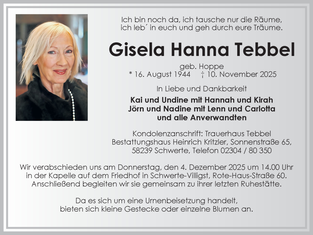 Hier finden Sie alle Traueranzeigen aus der Zeitung, die bisher für Gisela Hanna Tebbel erschienen sind. Weitere Traueranzeigen, die in der Zeitung erscheinen, werden hier ebenfalls aufgelistet